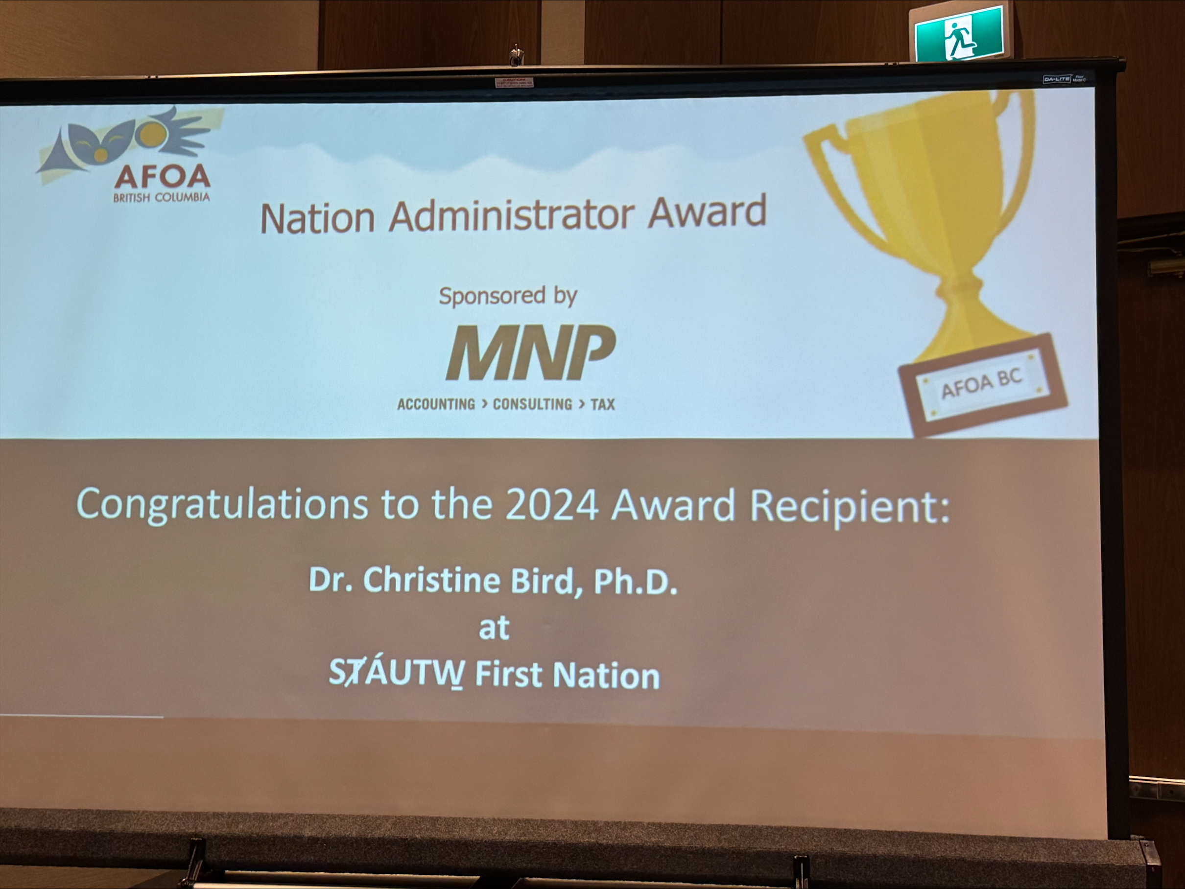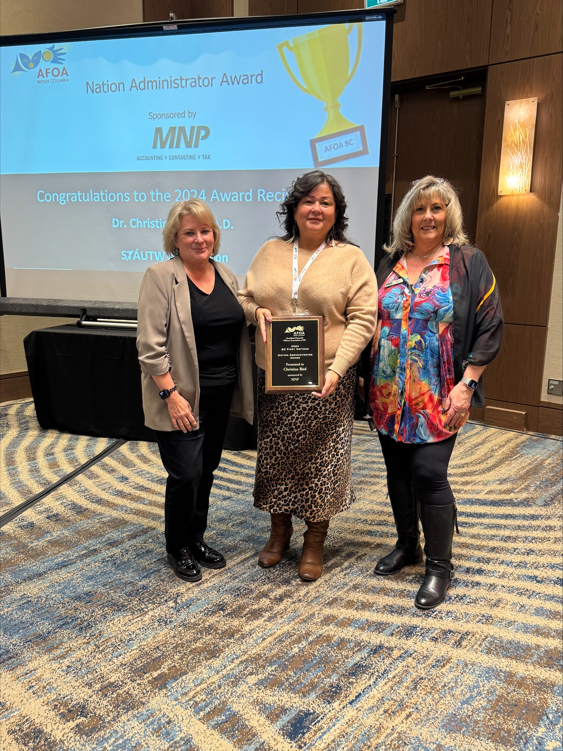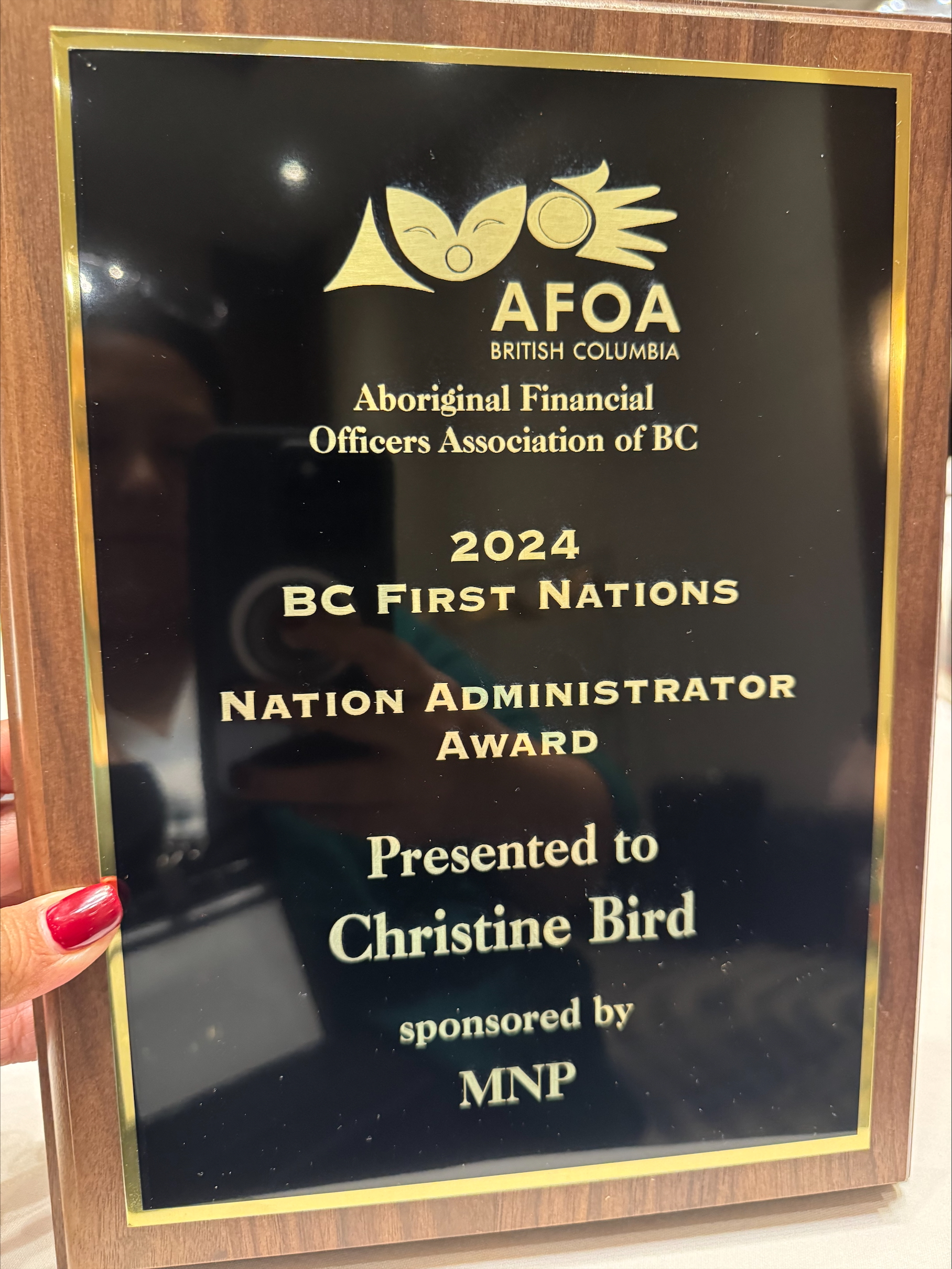 Dr. Christine Bird has been honoured with the First Nation Administrator Award from the Aboriginal Financial Officers Association of BC (AFOA). This award recognizes her exceptional leadership, financial management, and dedication to fostering growth and stability within SȾÁUTW̱ (SȾÁUTW̱ ) First Nation.