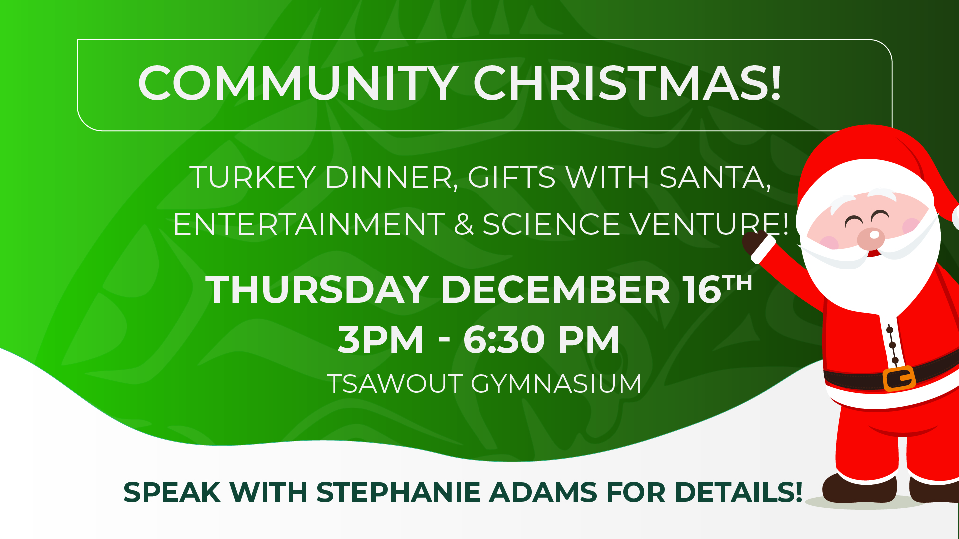 We're excited to announce the upcoming Community Christmas event at Tsawout. Join us Thursday December 16 from 3:00pm to 6:30pm for a holiday celebration in the gym.
